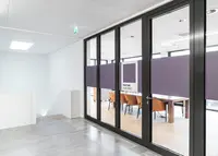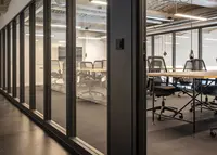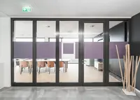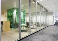 Das Trennwandsystem mit mittig liegender Brandschutzverglasung wird mit schmalem Aluminiumrand in stranggepresster Profilbauweise ausgeführt. Es erfüllt alle Anforderungen gemäss EI30 und lässt sich raumhoch oder mit Oberblende verbauen.