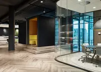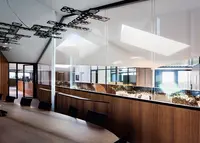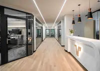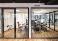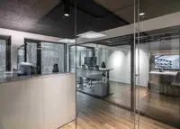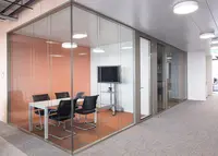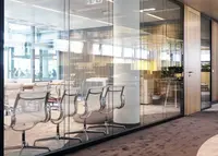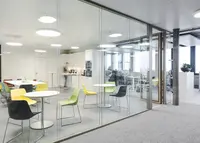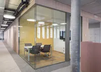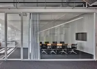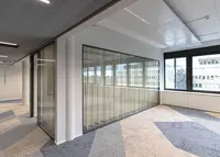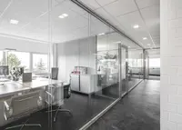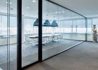 Das Trennwandsystem mit Zweischeiben-Verglasung wird als rahmenlose Ganzglaskonstruktion ohne vertikale Profile ausgeführt. Die Verglasung wird von Boden- und Deckenprofilen gehalten, fügt sich flächenbündig ein und erfüllt höchste Anforderungen an Transparenz und Schallschutz.