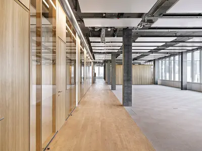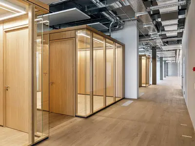 Glastrennwände und Echtholz: Ein harmonisches Duo für moderne Büroräume.