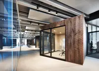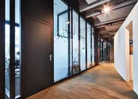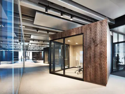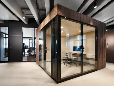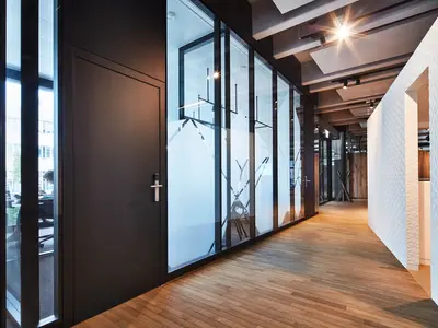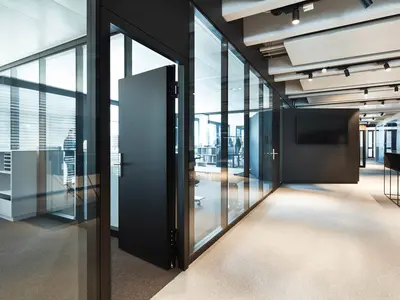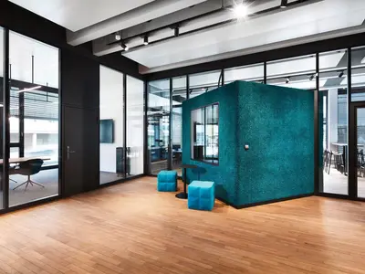 Offene und transparente Atmosphäre: mittels raumhohen Glastrennwänden und multifunktionalen Kuben.
