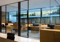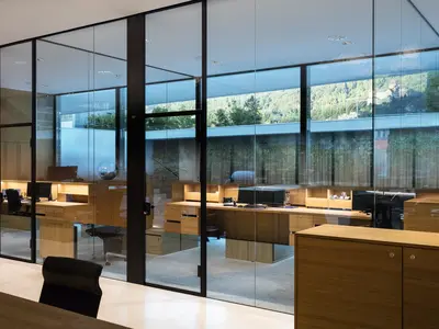 Das Trennwandsystem mit Zweischeiben-Verglasung wird als rahmenlose Ganzglaskonstruktion ohne vertikale Profile ausgeführt. Die Verglasung wird von Boden- und Deckenprofilen gehalten, fügt sich flächenbündig ein und erfüllt höchste Anforderungen an Transparenz und Schallschutz.