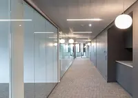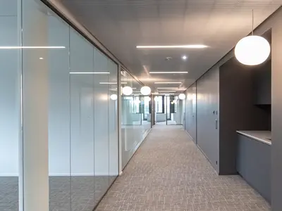 Das Trennwandsystem mit Zweischeiben-Verglasung wird als rahmenlose Ganzglaskonstruktion ohne vertikale Profile ausgeführt. Die Verglasung wird von Boden- und Deckenprofilen gehalten, fügt sich flächenbündig ein und erfüllt höchste Anforderungen an Transparenz und Schallschutz.